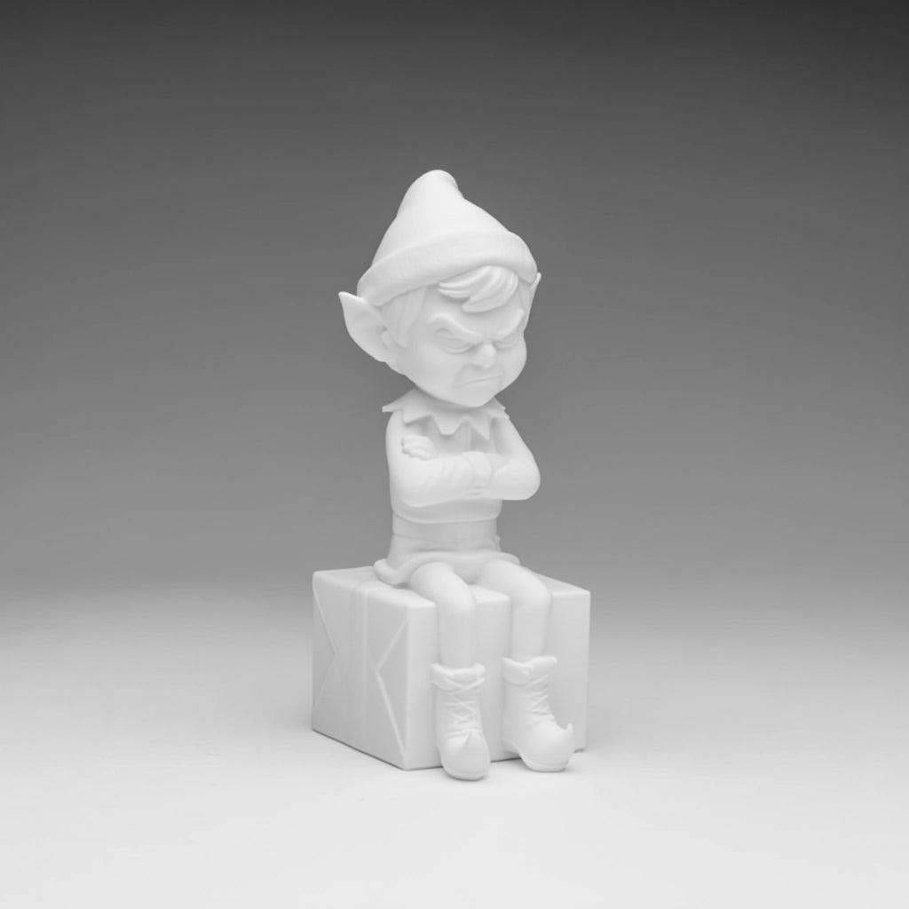 Someone clearly missed their morning sugarplums. This elf is so done with workshop duty, naughty-or-nice reports, and reindeer games. Perched on a crate with his arms crossed and a world-class scowl, he's the official mascot for holiday burnout.